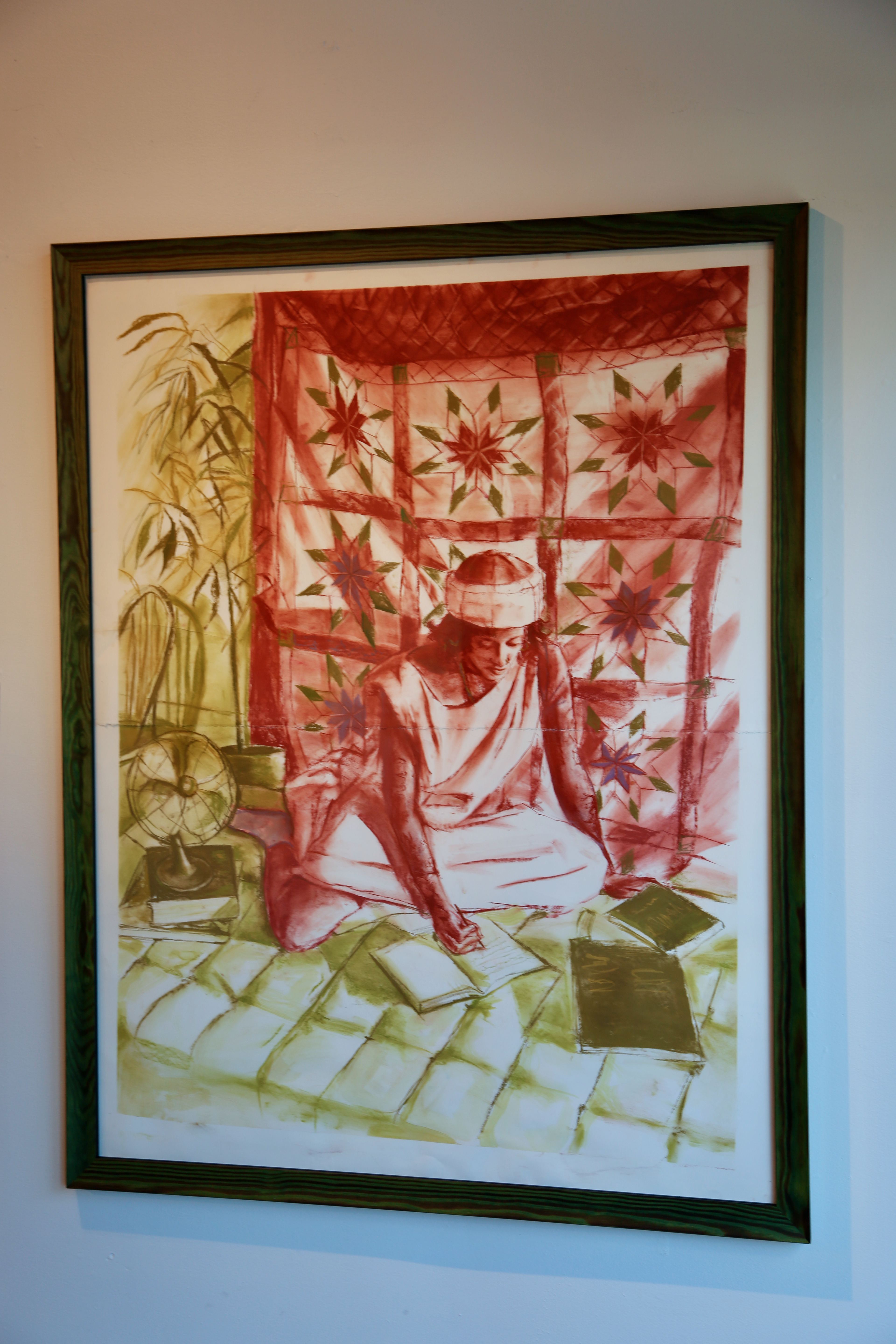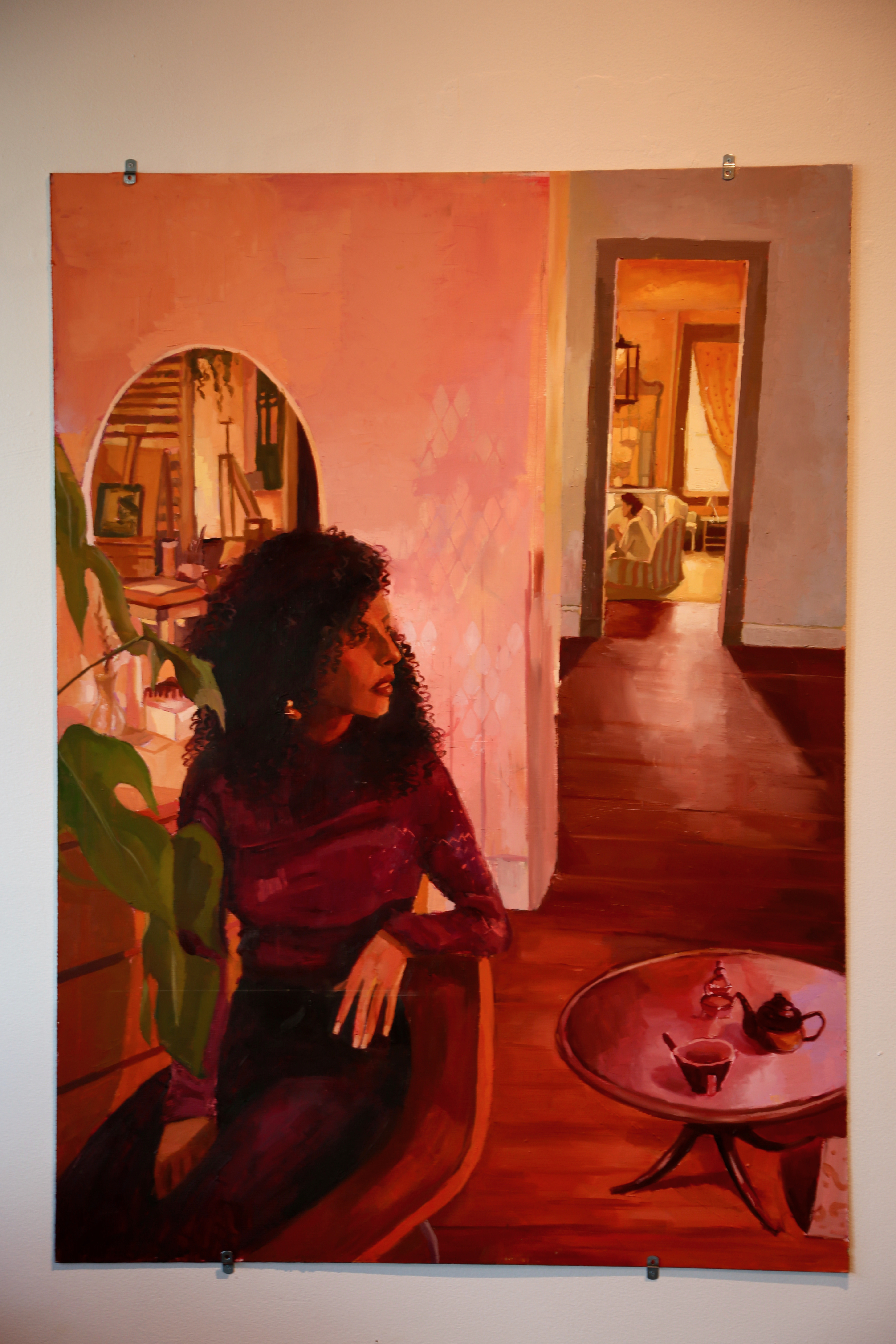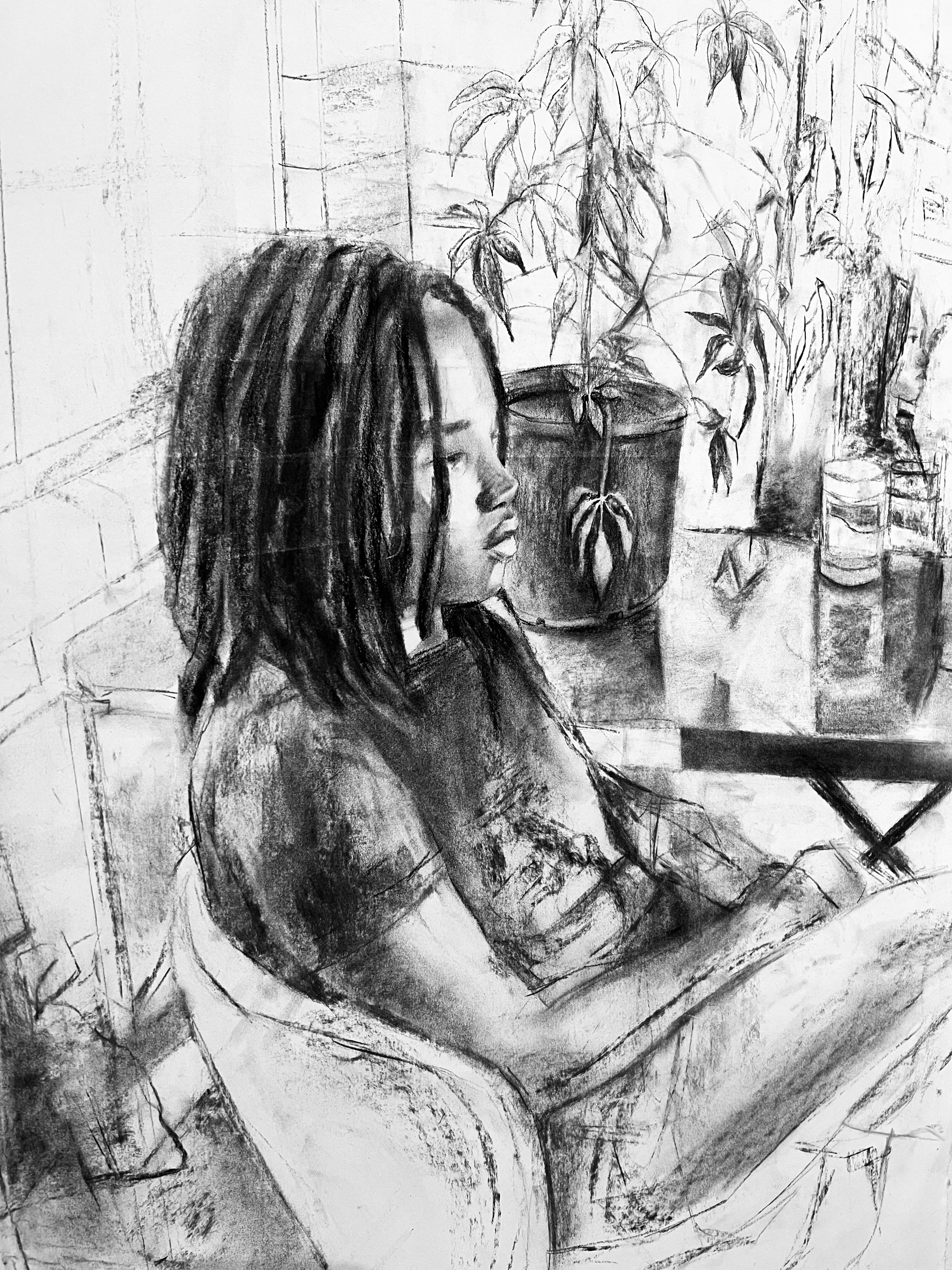 Lila’s work explores themes of identity, family history, and cultural exchange through food, music, and mutual understanding of generational trauma. While living in Seattle she has found a sense of community with folks throughout different diasporas. Connecting over topics like food, shared culture, and music has been healing to her sense of being. She feels grounded being around people who share a sense of understanding and wants to share an honest representation of their identity by creating an intimate and immersive setting for the viewer. Lila creates this intimate and immersive experience by using light and color to depict familiar spaces of her life with visual beauty. She achieves this by emphasizing the steady movement of light in the composition. She enjoys giving hints about the subject’s interests and identity by including objects of importance to the individual. Lila’s driven to create these honest and beautiful depictions due to the lack of representation of black and queer folks in comfort and ease in the canon of Western art. She wants her work to act as a vessel of escapism for people who have faced generational trauma and injustices in our society because they deserve a sense of solace too.